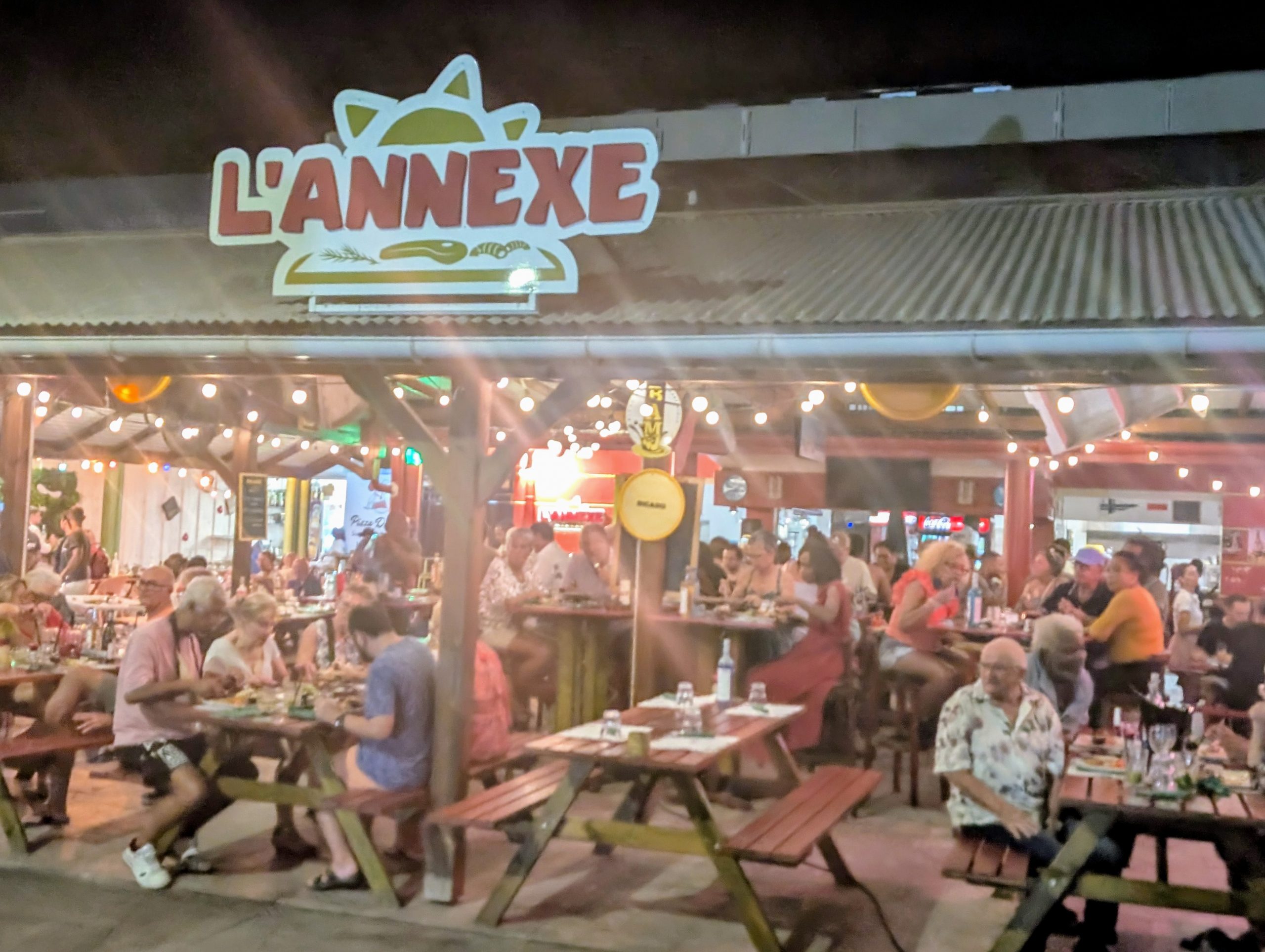 The pictures show the bar L’Annexe, the meeting point of sailors at the marina and a part of the marina with 2 pontons with sailing boats The bar and restaurant L’Annex, where we had our dinner the  night before we left for our sailing trip Most of the boats are catamarins. Only a few monocoques. And of course motorboats.